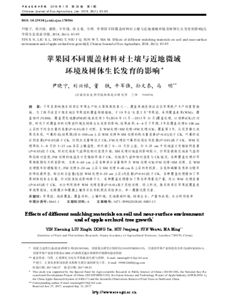 近日,由我院林果花卉研究所苹果研究室发表在《中国生态农业学报》2018年1月第26卷第1期的论文“苹果园不同覆盖材料对土壤与近地微域环境及树体生长发育的影响”,被中国科学技术信息研究所评为2021年度“F5000(领跑者5000)中国精品科技期刊顶尖学术论文”。该论文尹晓宁为第一作者,通讯作者为马明研究员。该文于2010年11月-2013年11月连续三年,研究不同处理(麦草覆盖(WM)、细河沙覆盖(SM)、黑色地膜覆盖(FM))对苹果园环境及树体生长发育的影响,对比分析了不同果树生育期水分耗散、地表温湿度及果实品质的动态变化,结果表明陇东雨养区苹果园覆盖麦草效果较佳,长期覆沙和覆膜土壤须补充有机肥及其他养分,单一覆膜还需完善。果园覆草是一项集保墒、提高土壤有机质、改良土壤、秸秆还田利用等肥沃土壤的表本兼治多功能技术措施,应大力推广应用。