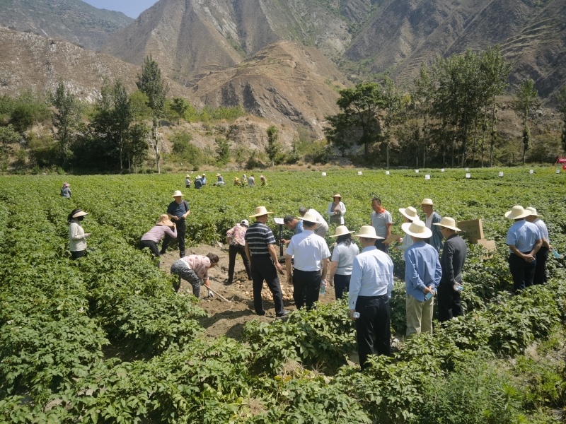 与会专家深入田间开展实地评估,一致认为试验示范区马铃薯植株健壮、根系发达、叶色浓绿,特别是块茎膨大均匀,展现出显著增产潜力,对项目实施效果给予了充分肯定,同时,对项目后续方案的实施提出了优化完善的建议。