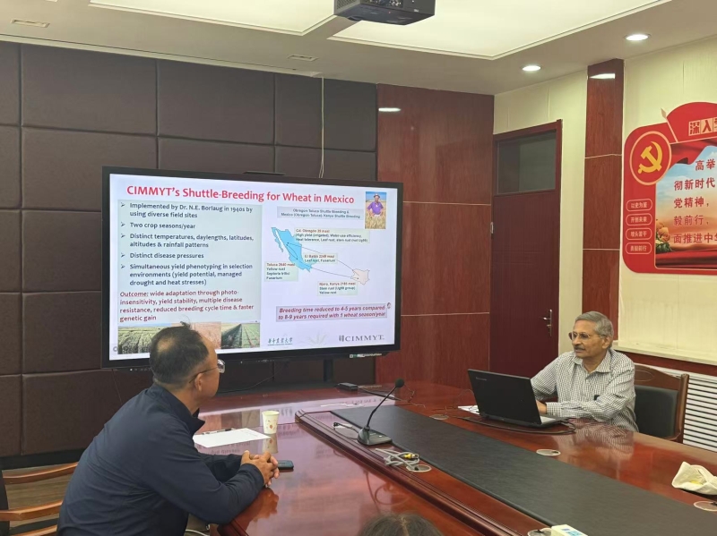 5月24-26日,2025年甘肃海智计划“国外优质多抗小麦种质资源的引进与创新利用”项目引进的国际玉米小麦改良中心(CIMMIT)杰出科学家、全球小麦改良负责人Ravi Prakash Singh博士和高级科学家、农业生理和模型专家熊伟博士一行2人,应小麦所邀请,赴清水试验站开展小麦抗病育种合作与交流。两位科学家现场考察了清水试验站小麦育种试验田和旺泽泉种业有限公司大面积示范的兰天系列新品种,对引进CIMMYT及其他国家的抗条锈病种质资源的田间表现及利用情况进行了详细观察,并就如何深化抗病种质资源利用、培育具有持久抗性的小麦新品种提出了建设性意见。期间两位教授还在清水试验站分别作了《Accelerating Wheat Improvement for Global Food Security and Nutrition》和《Data-based Crop Modeling to Accelerate Crop Breeding under Climate Change》的学术报告。院科技合作交流处副处长白斌、小麦所春小麦研究室主任王世红、冬小麦研究室和分子育种研究室的工作人员及研究生参加了访问活动和学术报告会议。