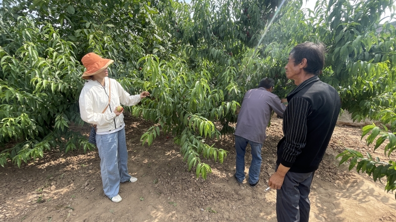 在曹家湾村的桃园里,牛茹萱根据不同桃园的管理情况从树形修剪、专用肥料的使用、灌水时机的掌控,不同病虫害的最佳防控期等方面开展了技术指导。