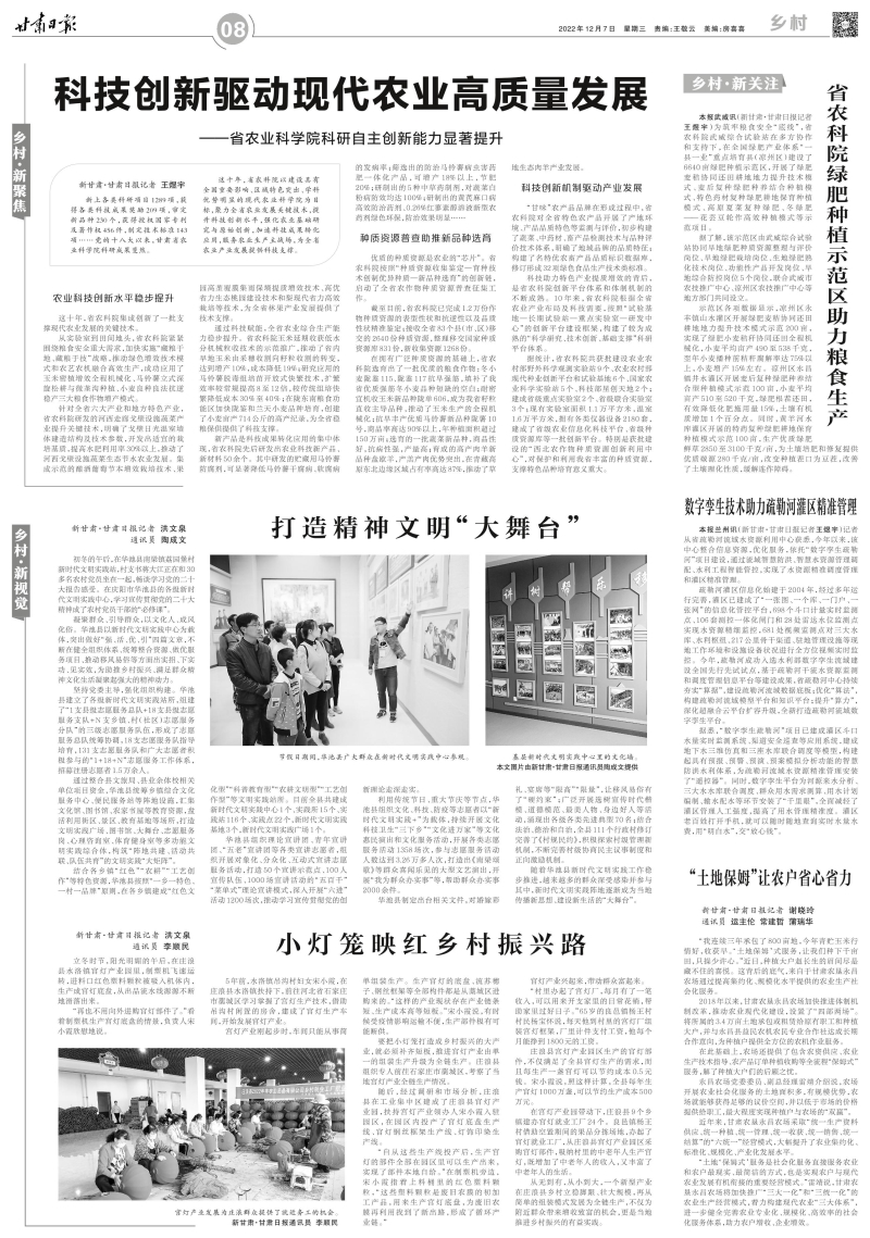 12月7日,甘肃日报乡村版以“科技创新驱动现代农业高质量发展”为题,从农业科技创新、新品种选育及服务农业产业发展三个方面,对我院十八大以来科技创新发展业绩进行了综合报道,宣传助力我院更好服务支撑全省农业产业发展。
