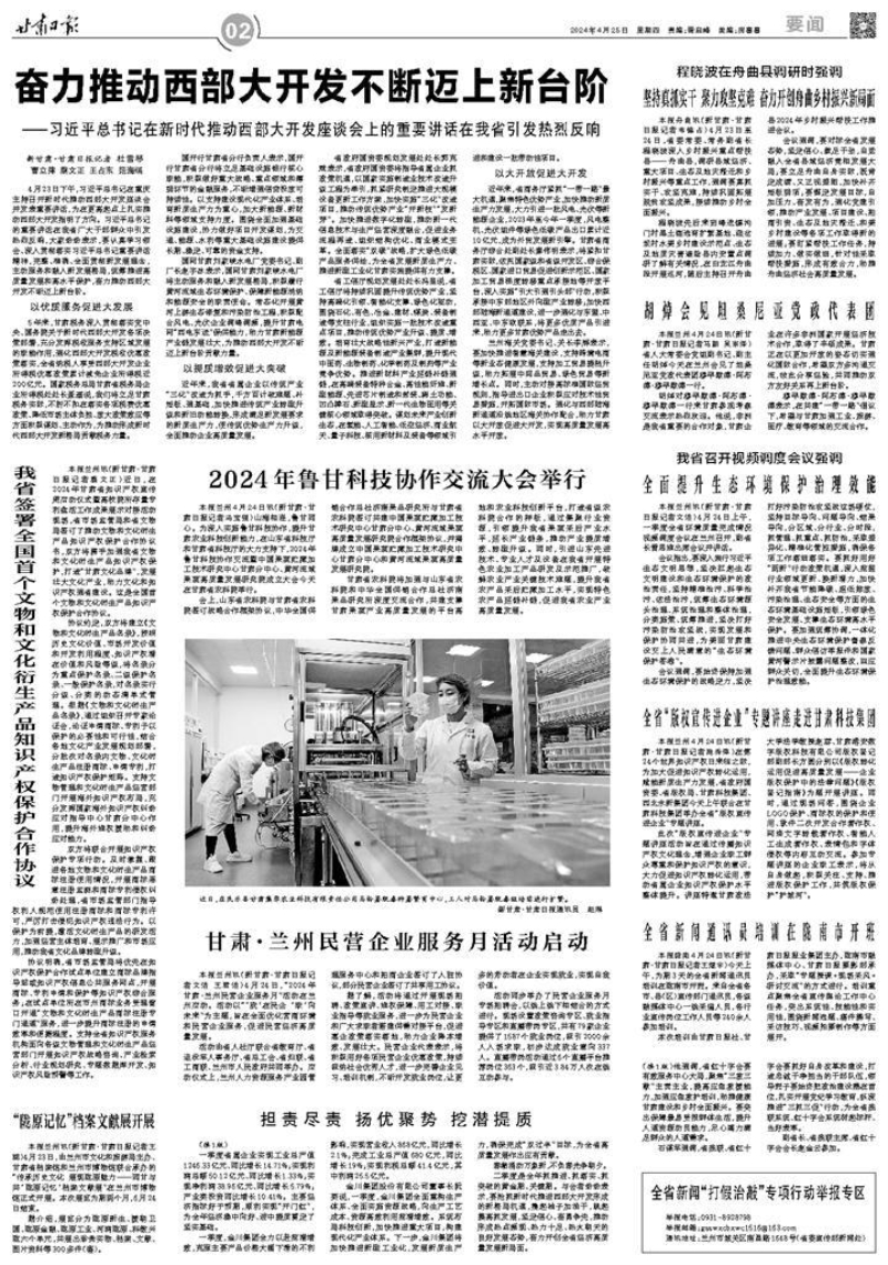 4月25日,甘肃日报要闻版以“2024年鲁甘科技协作交流大会举行”为题报道我院,全文如下: