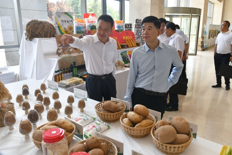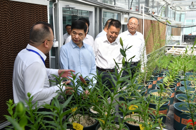 石谋军一行首先在我院特色作物繁育技术研究中心,调研了半夏、百合、马铃薯等特色作物快繁、选育情况。随后石谋军在我院主持召开工作座谈会,分别听取了甘肃农业大学党委书记赵凯和我院党委书记刘国汉的工作汇报。石谋军在讲话中对我院各项工作给予了充分肯定。他强调,甘肃农业大学和省农科院要发挥自身科研优势力量,把握全省农业整体态势,找准科技服务“三农”工作的切入点和突破口,真正践行强农兴农职责使命,以实际行动坚定拥护“两个确立”、坚决做到“两个维护”。要加强科技攻关,在优质种质资源、先进农技农艺、农机装备研发等方面开展技术攻坚,力争实现重大突破。要以助推农业产业发展为重点,建基地、强机制、抓服务,加强与农业龙头企业合作,积极推动“科技下乡”等活动,让更多科研成果尽快转化落地。要解决好科研人员实际困难,加强农学学科建设,提升学生实践能力,为加快农业强省建设提供源源不断的人才保障和支撑。