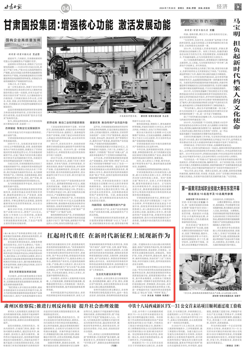 7月26日,甘肃日报头版以《扛起时代重任 在新时代新征程上展现新作为》为题报道我省干部群众热议党的二十届三中全会精神。院党委书记刘国汉代表我院就认真学习贯彻党的二十届三中全会精神作表态。他表示:省农科院将对标对表党中央作出的进一步深化改革的战略举措,锚定深化科技体制改革、深化人才发展体制机制改革等重大改革任务,坚持“四个面向”,发挥“引领、支撑、服务”职能,聚力打造现代一流农业科研院所,大力推进有组织的农业科技创新,围绕农业优质种质资源收集与利用、生物育种、农机装备研发、农产品质量安全、智慧农业等领域开展核心技术攻关。深化科技评价体系改革和科技成果转化机制改革,加快构建全省农业科技创新体系,奋力谱写新时代“三农”工作新篇章。