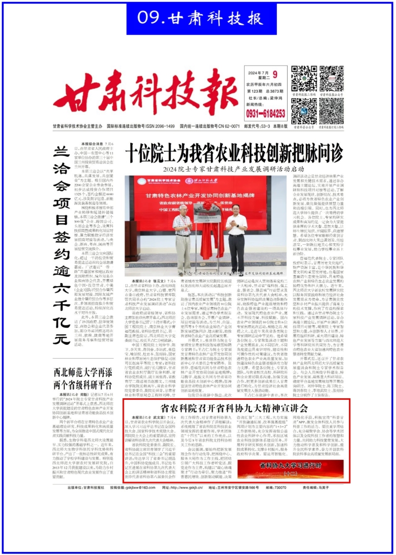 7月9日,甘肃科技报刊发《省农科院召开省科协九大精神宣讲会》。