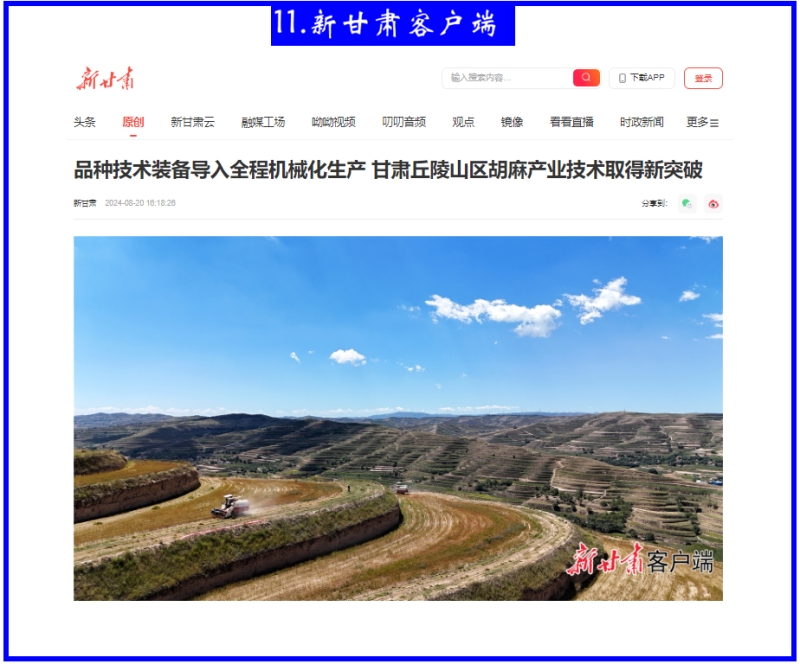 8月20日,新甘肃客户端以《品种技术装备导入全程机械化生产 甘肃丘陵山区胡麻产业技术取得新突破》为题报道我院推动胡麻产业技术取得突破性成效。