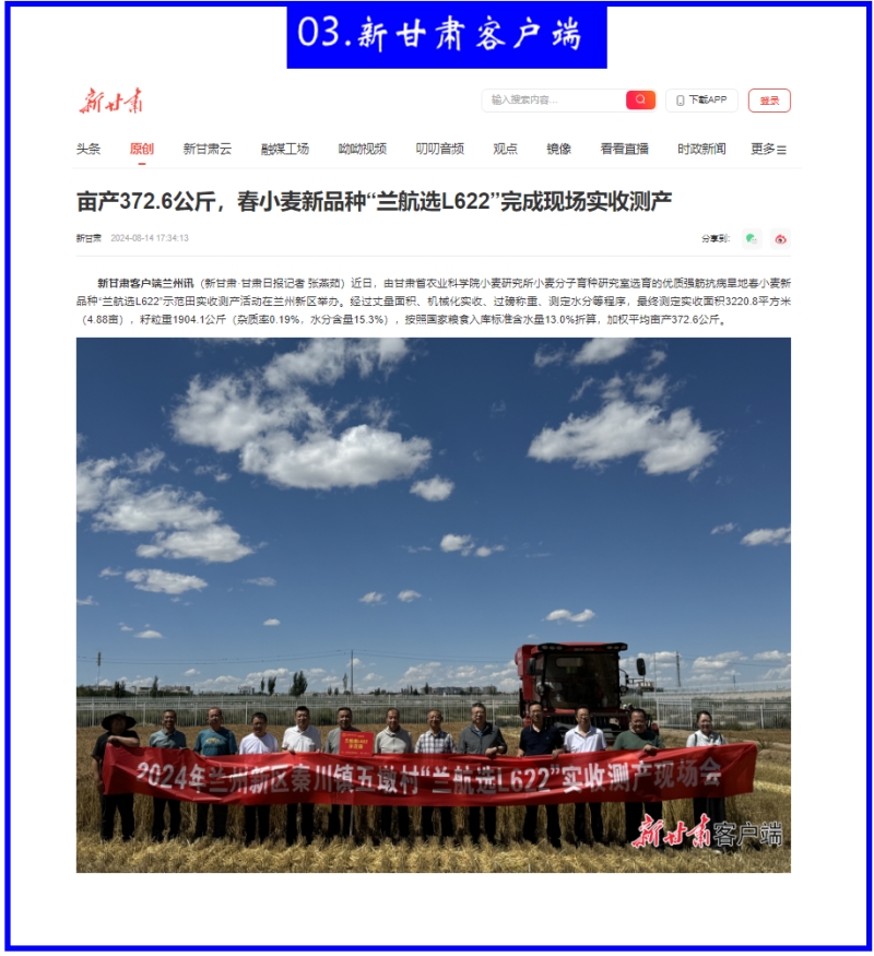 8月14日,新甘肃客户端以《亩产372.6公斤,春小麦新品种“兰航选L622”完成现场实收测产》为题报道我院科技创新成效。