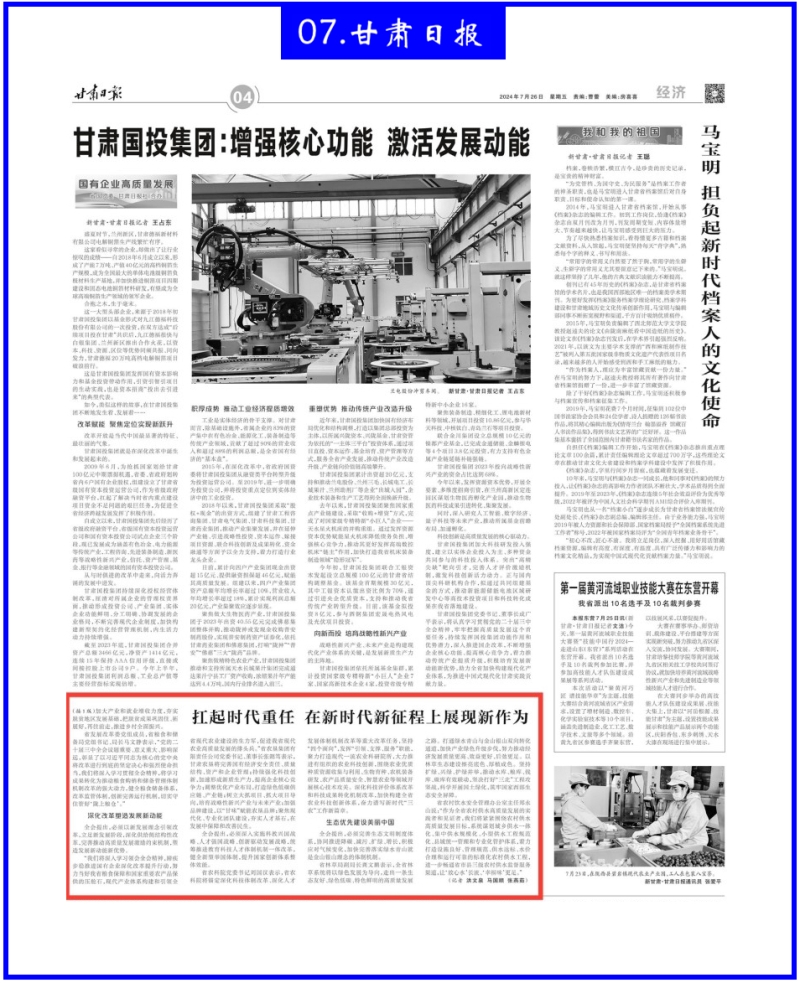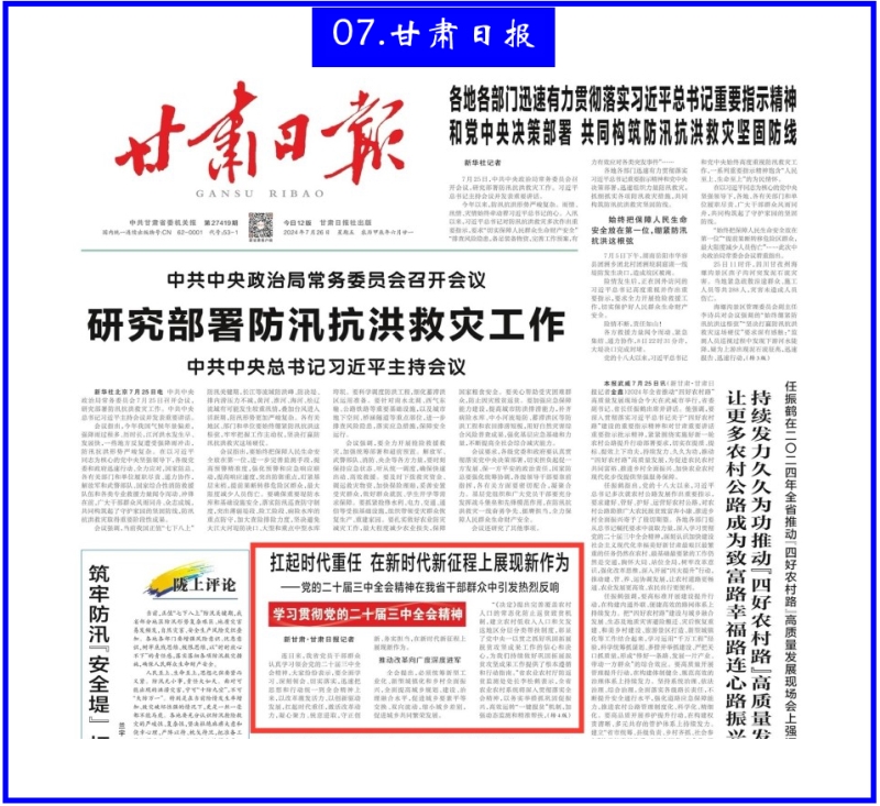 7月26日,甘肃日报头版以《扛起时代重任 在新时代新征程上展现新作为》为题报道我省干部群众热议党的二十届三中全会精神。院党委书记刘国汉代表我院就认真学习贯彻党的二十届三中全会精神作表态。他表示:省农科院将对标对表党中央作出的进一步深化改革的战略举措,锚定深化科技体制改革、深化人才发展体制机制改革等重大改革任务,坚持“四个面向”,发挥“引领、支撑、服务”职能,聚力打造现代一流农业科研院所,大力推进有组织的农业科技创新,围绕农业优质种质资源收集与利用、生物育种、农机装备研发、农产品质量安全、智慧农业等领域开展核心技术攻关。深化科技评价体系改革和科技成果转化机制改革,加快构建全省农业科技创新体系,奋力谱写新时代“三农”工作新篇章。