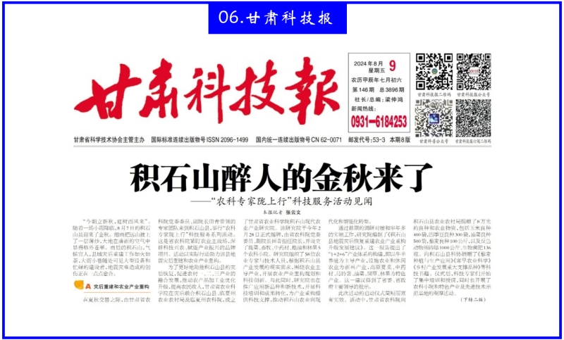 8月9日,甘肃科技报刊发《积石山醉人的金秋来了——“农科专家陇上行”科技服务活动见闻》。
