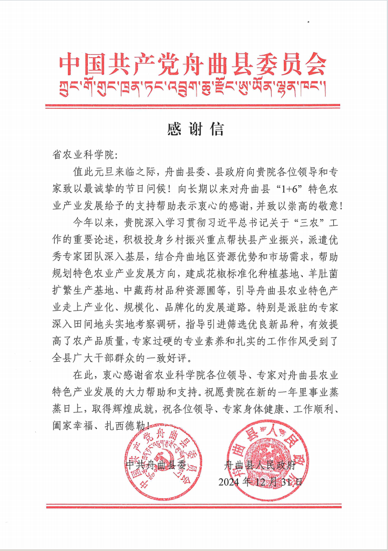 12月31日,中共舟曲县委,舟曲县人民政府向我院发来感谢信,对我院长期以来助力舟曲县“1+6”特色农业产业发展给予的支持和帮助表示感谢,原文如下: