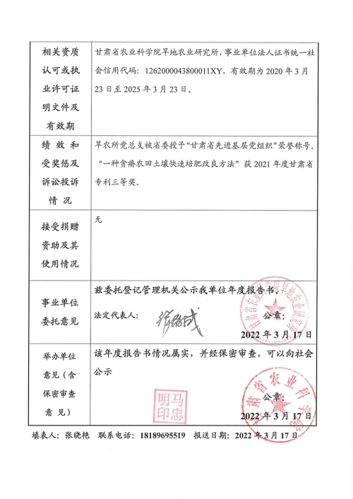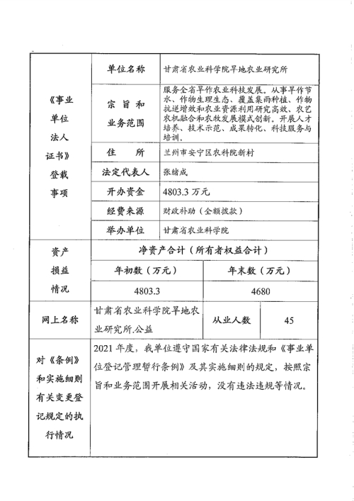 根据甘肃省事业单位登记局法人证书年检流程,现将我单位2021年度事业单位法人年度报告书予以公示,对报告书填写内容的真实性给予监督。