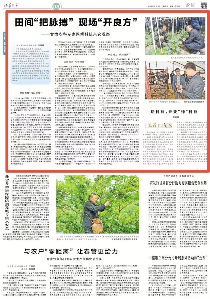 5月5日,《甘肃日报》以《田间“把脉搏”,现场“开良方”》”为题,对我院在庆阳市镇原县和平凉市崇信县开展的“农科专家陇上行”科技服务乡村振兴活动进行了综合报道。
