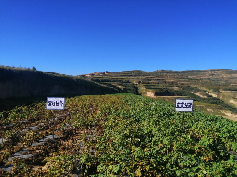 张绪成研究员介绍了项目基本概况及安定区团结镇高泉村示范点实施情况,专家们实地查看了“旱作区马铃薯立式深旋耕作技术”示范点并进行现场测产。测产结果表明,在今年降水较少干旱十分严峻的形势下,马铃薯立式深旋耕作较常规耕作田间生长优势明显,示范田产量达到2940 kg/亩,增产99.2%,大薯率和商品率也明显提高,抗旱性强。专家一致认为项目示范的立式深旋耕作技术抗旱增产增效显著,推广前景广阔。