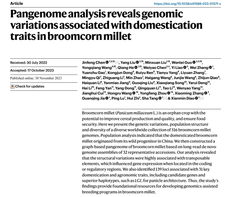 12月1日,《Nature Genetics》在线发表了糜子第一个高质量泛基因组和遗传变异图谱,开启了古老作物黍稷的分子育种时代,这是糜子研究中首篇影响因子超30分的文章。该研究系统解析了全球516个多样化的糜子基因组遗传变异、群体结构、起源演化历史与基因组驯化特征。并基于32个代表性品种的长读全新组装基因组构建了一个基于图形的糜子全基因组,揭示了结构变异与可转座元件密切相关。此外,鉴定出了与31个关键驯化和农艺性状相关的139个位点,包括候选基因和优势单体型。该研究结果为发展以基因组学为辅助的糜子育种计划提供了基础资源。