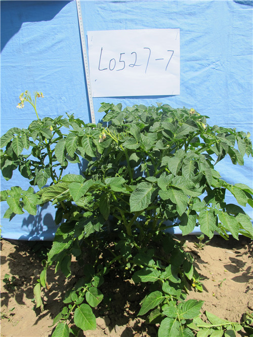 特征特性:晚熟,出苗后121天可收获。株型半直立,株高60~65cm左右,生长势较强,分枝数中等,茎绿色。复叶较大,叶缘平展;叶绿色,花冠白色;天然结实性强。匍匐茎短、结薯集中。块茎长椭圆形,淡黄皮淡黄肉,表皮粗糙,较大而整齐,芽眼浅。煮食口感和风味好,炸片评分80。鲜薯干物质含量25.60%,淀粉含量20.1%,粗蛋白质含量2.57%,维生素C含量在14.98mg/100g,还原糖含量0.106%。鲜薯食用、淀粉加工和全粉加工。植株高抗晚疫病,对花叶病毒病具有较好的田间抗性。