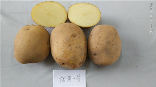 特征特性:晚熟,生育期124天左右。株型直立,株高55~65cm。茎绿色,叶片浅绿色,花冠白色,无天然结实。结薯集中,单株结薯4~5个,大中薯重率82%以上。薯块圆形,黄皮黄肉,芽眼深浅中等,薯皮微网纹,薯形评价较好,耐运输,耐贮藏。薯块含干物质23.7%,淀粉18.68%,粗蛋白3.16%,维生素C 14.42mg/100g,还原糖0.162%,食味优。抗晚疫病,对卷叶病毒病具有较好的田间抗性。