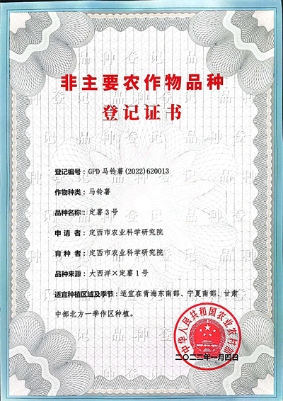 定西市农业科学研究院选育。晚熟,生育期128天左右,株型直立,株高68.5厘米,单株主茎数2.8个,成株繁茂。茎基部以上分枝较多,茎绿色,叶片较小,叶深绿色,叶缘平展,小叶着生较密,茎翼呈波状,茎横断面三菱形。花冠白色,天然结实差;薯块圆形,薯皮较粗,白皮白肉,芽眼浅而少;结薯集中,单株平均结薯数6.3个,平均单薯重118.1克,薯块商品率86.5﹪。薯块淀粉含量17.9﹪,干物质含量26.5﹪,还原糖含量0.21﹪,粗蛋白含量2.12﹪,VC含量15.9毫克/100克,适合鲜薯食用、淀粉、全粉和薯片加工。耐运输、贮藏;中抗晚疫病,抗马铃薯X病毒(PVX)和抗马铃薯Y病毒(PVY)。平均亩产量2200-4000kg。