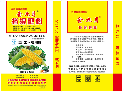 金九月玉米专用掺混肥,(N+P2O5+K2O≥40%,23-12-5)由内部绝密信封料39土壤肥料与节水农业研究所研制,甘肃金九月肥业有限公司生产,根据玉米养分需求规律、主产区土壤特征以及多年施肥试验结果研发而成的一种作物专用肥料,本产品综合考虑了玉米对大、中、微量元素的全面需求,配方独特,肥料利用率高。