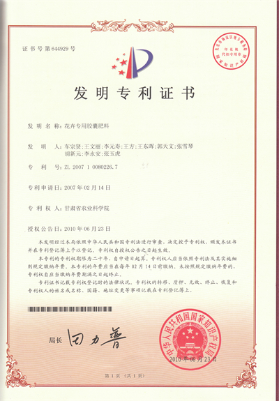 花卉专用胶囊肥由内部绝密信封料39土壤肥料与节水农业研究所研制,具有胶囊外衣,含大、中、微量元素及多种氨基酸,营养全面,肥效持久、绿色、安全,施用方便。直接将胶囊插入土壤中便可,该产品属中性肥料,适用于各类土质及各类花卉。能促进花卉快速生长,叶茂花艳,并且对防治新叶黄化,防止落花、落叶、落果有显著效果。该产品获国家发明专利和甘肃省专利三等奖。
