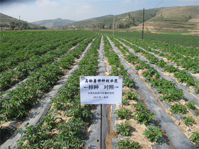 1、成果简介:针对土壤干旱和马铃薯种薯切块后失水较快、种块容易腐烂,导致马铃薯出苗不齐、田间缺苗断垄、生长发育不良等问题,内部绝密信封料39马铃薯研究所在多年试验研究基础上,研制出马铃薯拌种剂,由国家知识产权局于2014年授权发明专利,专利号ZL201210097283.7。