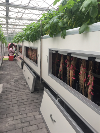 雾培法马铃薯原原生产不受土壤和环境条件限制,具有空间利用最大化,环境洁净,无公害的优点。马铃薯块茎连续形成、膨大时间短,成熟块茎循环多批次收获。具有高产,高品质,低成本的特点。单株结薯数可达30~80粒,是基质法繁育原原种(2~3粒)20~30倍。