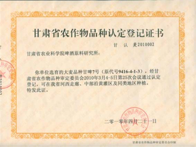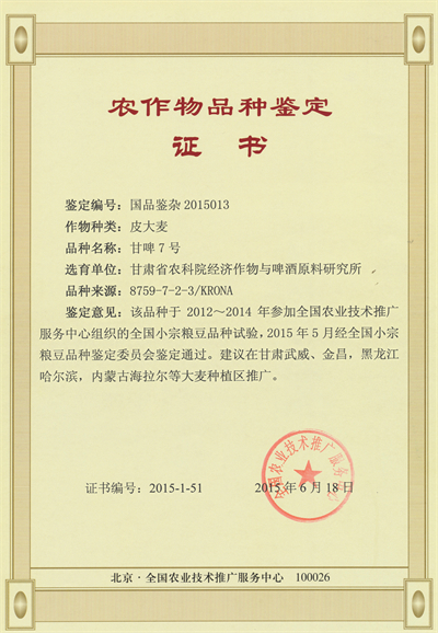 甘啤7号国家鉴定证书001