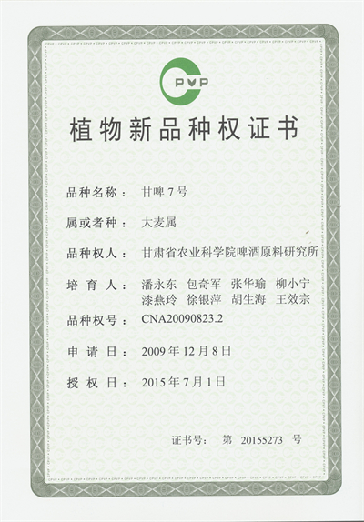 甘啤7号品种认定证书