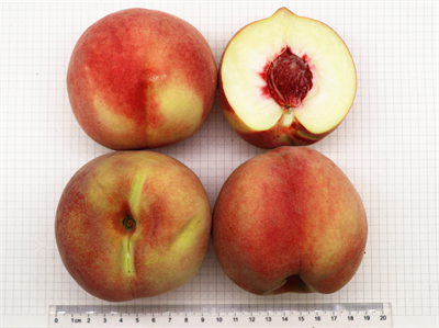果实发育期100天,中熟品种。平均单果重310克,最大单果重364克;可溶性固形物含量14.3%,果肉浅黄色,不溶质,粘核,风味浓甜,香气浓郁;果实近圆形,果顶微凸,果形端正,果实着红色晕。该品种在兰州安宁区7月底成熟。适宜在甘肃省兰州市、天水市、陇南市等桃产区种植。