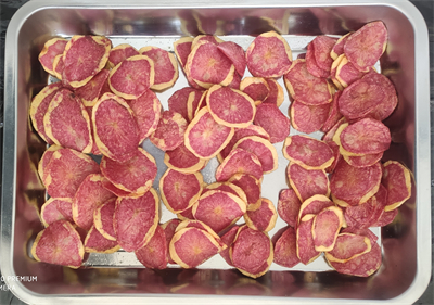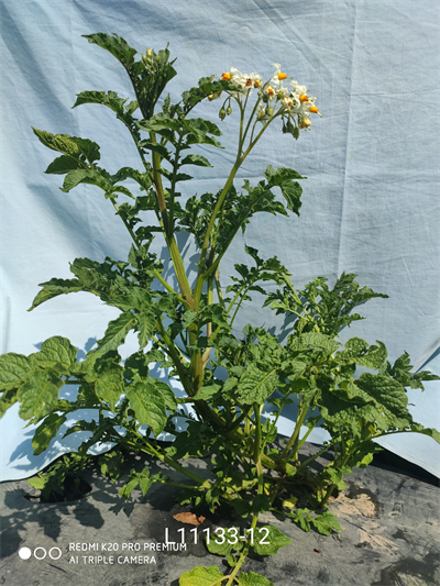 陇薯26号,原代号L11133-12,鲜食及彩色薯片加工型。生育期100d左右,中晚熟。植株直立,株高约70cm,茎绿带紫红色,叶片绿色,小叶稀疏,叶面微皱,叶缘波状,花冠白色,星形,萼片绿色。薯块长椭圆形,薯皮红色光滑,芽眼浅,薯肉红色近皮层黄色,薯块含干物质19.47%,粗淀粉13.50%,还原糖0.16%,粗蛋白2.77 g/100g,维生素C 17.65 mg/100g,铁15.4mg/kg,锌3.13 mg/ kg,硒10.62ug/kg(干基)。油炸薯片色泽鲜艳美观,口感酥脆,薯香味浓。平均亩产2432.70kg。适宜在甘肃省高寒阴湿区、二阴地区及半干旱地区推广种植。