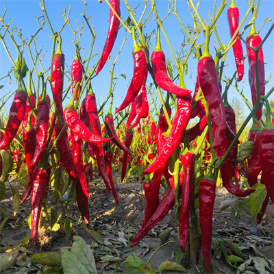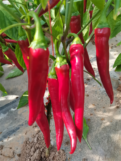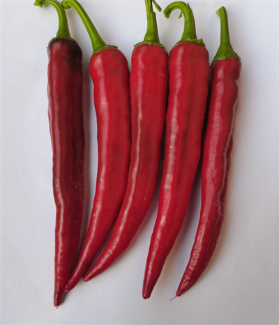 杂种一代制干型辣椒品种,植株长势较强,株高70-75cm,早熟锥形椒,始花节位第 10-12节,属中早熟品种,从定植到采收116天(d)左右,叶片绿色,长卵圆形;果实锥形,果面光滑,有光泽,果长14.5cm,果宽 3.0cm,肉厚约1.8mm,青熟果为绿色,老熟果为暗红色,干椒平均单果重3.6g,色价高,辣味中等,果实商品性好,成熟期一致,每 667m2 干椒产量在522kg左右,适合在甘肃河西走廊地区及西北相同气候区域种植。