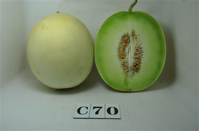 21C70厚皮甜瓜杂种一代品种,长势强,抗病性好,全生育期100~110天,果实发育期40~45天;果实近圆形,果形指数1.1~1.2;果皮灰白色;果肉翠绿色,肉厚4.8~5.5cm,果肉中心可溶性固形物含量15.4%~16.8%;肉质酥多汁,风味浓郁。单果重约2.0~2.5kg,亩产量达2400~3500kg。