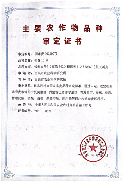 1、简介:小麦新品种银春10号是白银市农科所2006年以自育小麦品种银春8号搭载我国首颗航天育种卫星“实践八号”,经2007-2016年多年选育而成。2017年通过甘肃省品种审定和成果登记,2021年通过第四届国家农作物品种审定委员会审定。属春小麦,全生育期104天,比宁春4号早熟2天,株高85-87cm,亩穗数41.1-43.1万穗,穗粒数39.0粒,千粒重45.3-46.6g,蛋白质含量14.51%,湿面筋29.3%。在国家区域试验中平均亩产519kg,较对照宁春4号增产3.9%。
