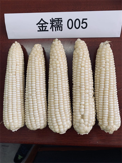 金糯005鲜果穗籽粒排列整齐、饱满,色泽纯正,外观商品性好;籽粒粘糯,煮食风味鲜、软、香、粘、糯,嫩薄无渣,口感佳,适口性好,品尝鉴定得分86.3。农业农村部谷物及制品质量监督检验测试中心(哈尔滨)检测,干籽粒含粗蛋白0.87%,粗脂肪4.33%,粗淀粉71.84%,粗淀粉中支链淀粉含量100%。