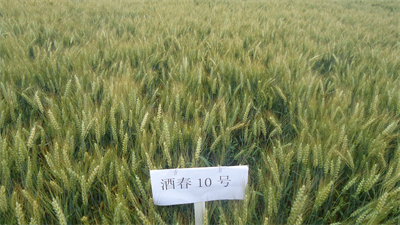 酒春10号是由酒泉市农业科学研究院选育的春小麦新品种。属中熟品种,生育期101天左右,幼苗直立,叶色深绿,株高90厘米左右,长芒,白穗,穗长方型,籽粒琥珀色,角质,千粒重44.25克左右,容重803.8克/升。穗粒数41.9粒,亩穗数39.17万左右。株型紧凑,旗叶上举。粗蛋白(干基)含量14.69%,湿面筋30.5%(以14%水分计),Zeleny沉淀值33.0毫升,吸水量59.1毫升/100克,面团形成时间7.3分,稳定时间6.3分,弱化度122F.U,粉质质量指数107毫米,评价值65。2016-2017年甘肃省西片水地组区域试验两年平均亩产526.56公斤,较对照宁春4号增产6.56%。2018年生产试验6点平均折合亩产545.77kg,较对照宁春4号增产4.29%。适宜在甘肃省河西水地品种类型区种植。