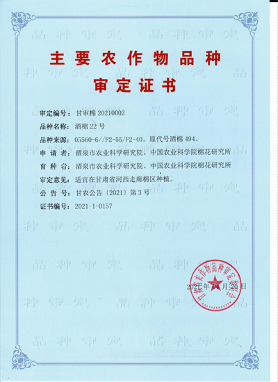 品种简介:酒棉22号(原代号酒棉494)由酒泉市农业科学研究院与中国农科院棉花研究所联合选育,2021年通过甘肃省品种审定。生育期135天,霜前花率96.2%。单株结铃7.9个,单铃重5g,衣分41.7%。纤维平均长度30.3mm,比强度28.5cN/tex,马克隆值4.6。抗枯萎病、抗黄萎病。亩产籽棉382.0kg、皮棉160.8kg。