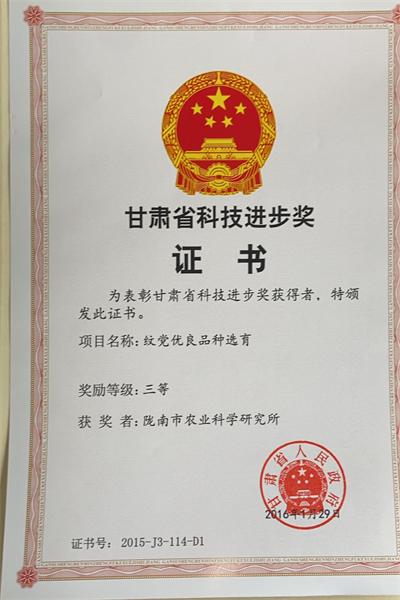 《纹党优良品种选育》项目成果获得2014年陇南市科技进步一等奖,2015年甘肃省科技进步三等奖。内容主要有:①项目提出了纹党优良品种的选育方法和思路,给中草药优良品种的选育摸索出了成功经验和途径;②探索出了纹党优良品种选育的技术路线方案。按确定的育种目标要求进行定向选育,采用单株多次选择法进行选种,首先收集纹党种质资源(包括野生资源)的优良单株种子,建立种质资源圃(即原始材料圃),集中种植观察,多次从中选优,直到后代生长性状表现一致、遗传性趋于稳定的可确定为新品系;③选育出了纹党优良品系—WD2006-1;④掌握了与新品系相配套的丰产栽培技术,总结编写出了《陇南纹党规范化生产技术规程》;⑤掌握了纹党丰产的关键技术是育苗移栽和控制开花结籽、控制地上部徒长。