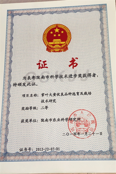 《掌叶大黄优良品种选育及栽培技术研究》项目成果获得2012陇南市科技进步二等奖。内容主要有:①丰产性好。2011-2012年,大黄新品系DH2006-1进行了多点试验,折合平均亩产914.28公斤,比对照增产123.28㎏,增长15.58%。②抗病性突出。经甘肃省农科院植保所抗性鉴定,DXH2006-1品系根腐病平均发病率为3.6%,较对照低0.4个百分点,病情指数平均为1.8%,较对照低0.3个百分点。③品质优良。2012年兰州大学与药学院测定,大黄酸、大黄素、大黄酚总含量为6.5575%。超出2010版药典规定的不低于4%的标准。④早期抽薹率低。 掌叶大黄DH2006-1新品种大田抽薹率为4.94%,较普通大黄低7.23%。⑤综合农艺性状优良。DH2006-1茎直立,高2.3m左右,茎杆中空,光滑无毛。⑥适应性广。该品系适宜在甘肃省礼县、宕昌县、武都区及岷县等地,要求海拔1800-2500米,年降雨量500毫米的高寒阴湿区推广应用。⑦推广潜力大。DH2006-1以其优良的品质、较高的丰产性能、突出的抗病性和抗逆性,具有巨大的推广潜力和空间,对我市大黄生产品种格局必将产生不可估量的影响。⑧进行了栽培试验。从大黄种子育苗、不同密度、不同肥料的施用不同因素影响大黄抽薹等方面进行了科学试验。掌握了大黄生产的关键技术。