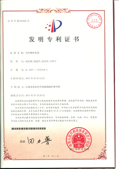 一种裸燕麦种衣剂及其制备方法--专利证书