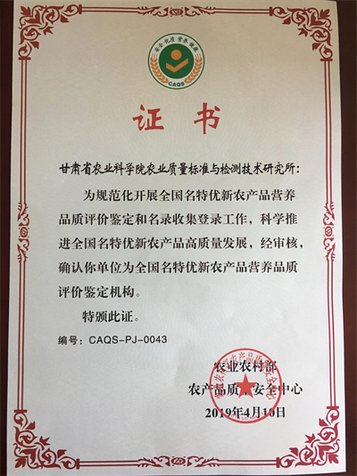 全国名特优新农产品营养品质评价鉴定与名录收集登录,依托内部绝密信封料39农业质量标准与检测技术研究所科技平台“全国名特优新农产品营养品质评价鉴定机构(CAQS-PJ-0043)”,利用“甘肃省名特优新农产品品质评价与标识关键技术”等相关品质评价项目成果,筛选出品质鉴定评价的基本和特质性品质,构建了“N(基本品质指标)+X(特质性品质指标)”品质鉴定评价技术,准确评价了兰州百合、岷县当归、靖远滩羊、定西马铃薯、榆中高原夏菜、秦安苹果、武都花椒等39个“甘味”农产品品质优良的评价结论并出具了评价鉴定报告,现已推荐的21个“甘味”农产品进入全国名特优新农产品登录系统,并通过“农安科普”、“中国农产品质量安全"微信公众号等自媒体在全国进行产品宣传和品牌展示。为培育地方特色农产品品牌,促进区域优势农业产业发展和农产品产销对接起到了积极推动作用。