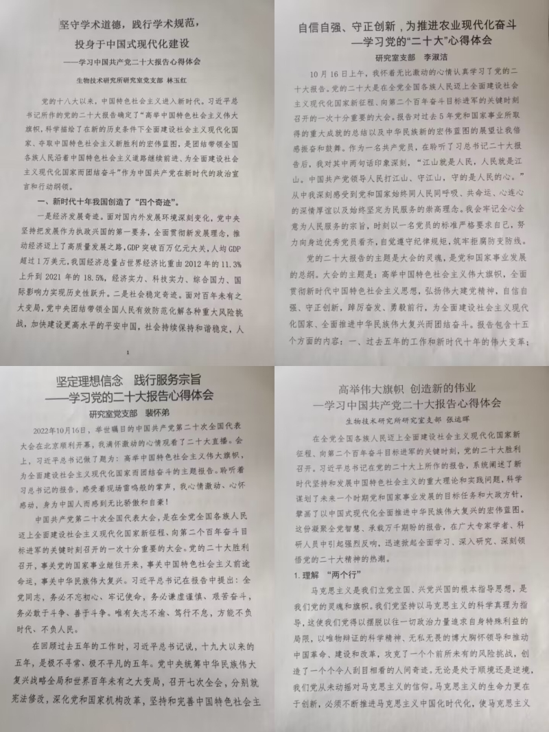 会议由支部书记裴怀弟同志主持,党员群众代表分别就学习党的二十大精神心得体会做了交流发言,会议氛围热烈,王立光同志说,要坚持原原本本学、融会贯通学、联系实际学,学出“拼”的精神、“闯”的劲头、“创”的勇气,不断重塑思想、深化认识、坚定信心、埋头苦干,切实把二十大精神转化为强大的精神动力,不断武装头脑、指导实践、努力提高本领,消除“本领恐慌”和“知识短板”,在本职岗位上兢兢业业,努力钻研,开拓创新;张敏敏同志说,作为新一代的农科人,我们既要做好二十大报告精神的学习、践行和传播,更要不忘初心、牢记使命,以前辈们“一生只干一件事,一件事干一生”的执着和奉献为榜样,做新时代“南繁精神”的践行者、创新者和传播者,积极投入农业科研,围绕生物技术发展趋势、聚焦以百合为代表的地方名优特农产品研发,根据市场需求,加快推进关键核心技术攻关。同志们对工作生活、疫情防控政策都表达了积极乐观的态度,并表示在今后的工作中严格按照会议精神,依靠科技自立自强,夯实国家粮食安全根基,推动农业绿色发展,踔厉奋发,勇毅前行。