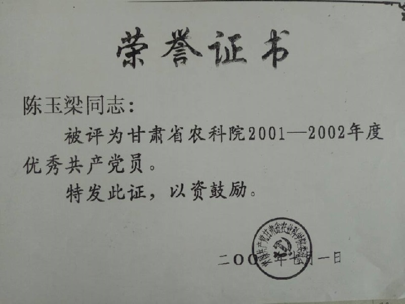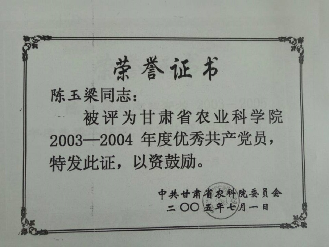 2002年、2005年被甘肃省农科院评为优秀共产党员;2006年被甘肃省农科院评为先进工作者。