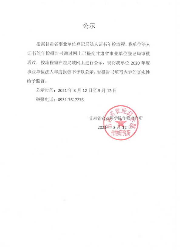 根据甘肃省事业单位登记局法人证书年检流程,现将我单位2020年度事业单位法人年度报告书予以公示,对报告书填写内容的真实性给予监督。