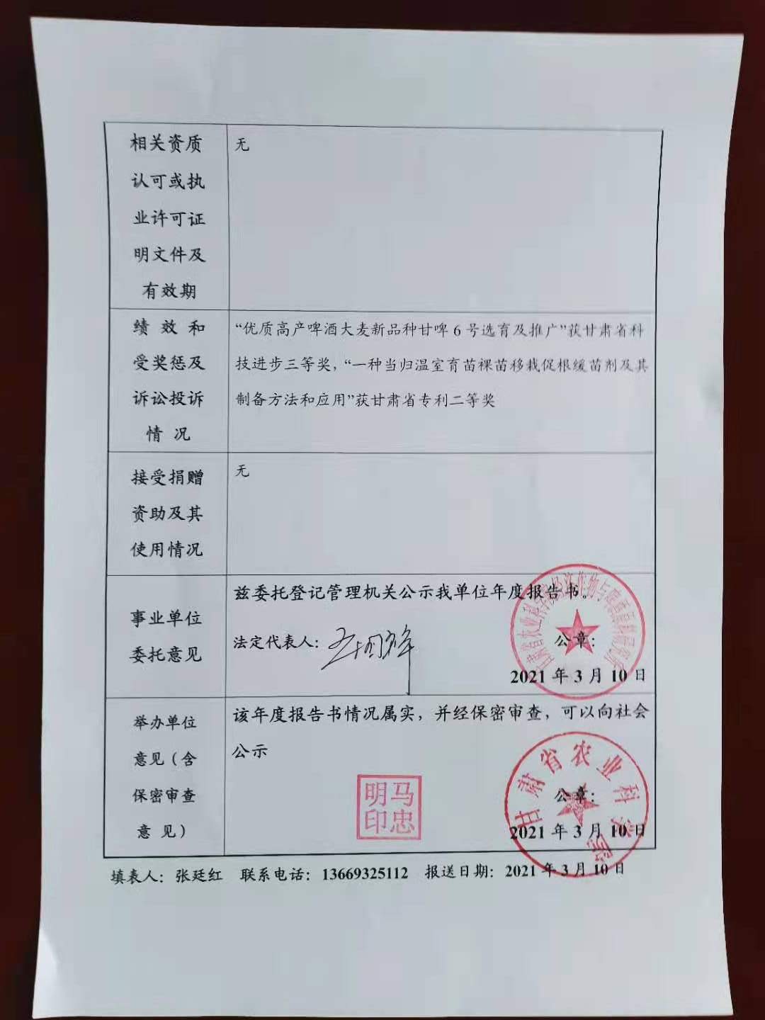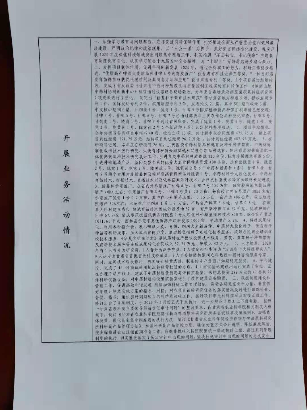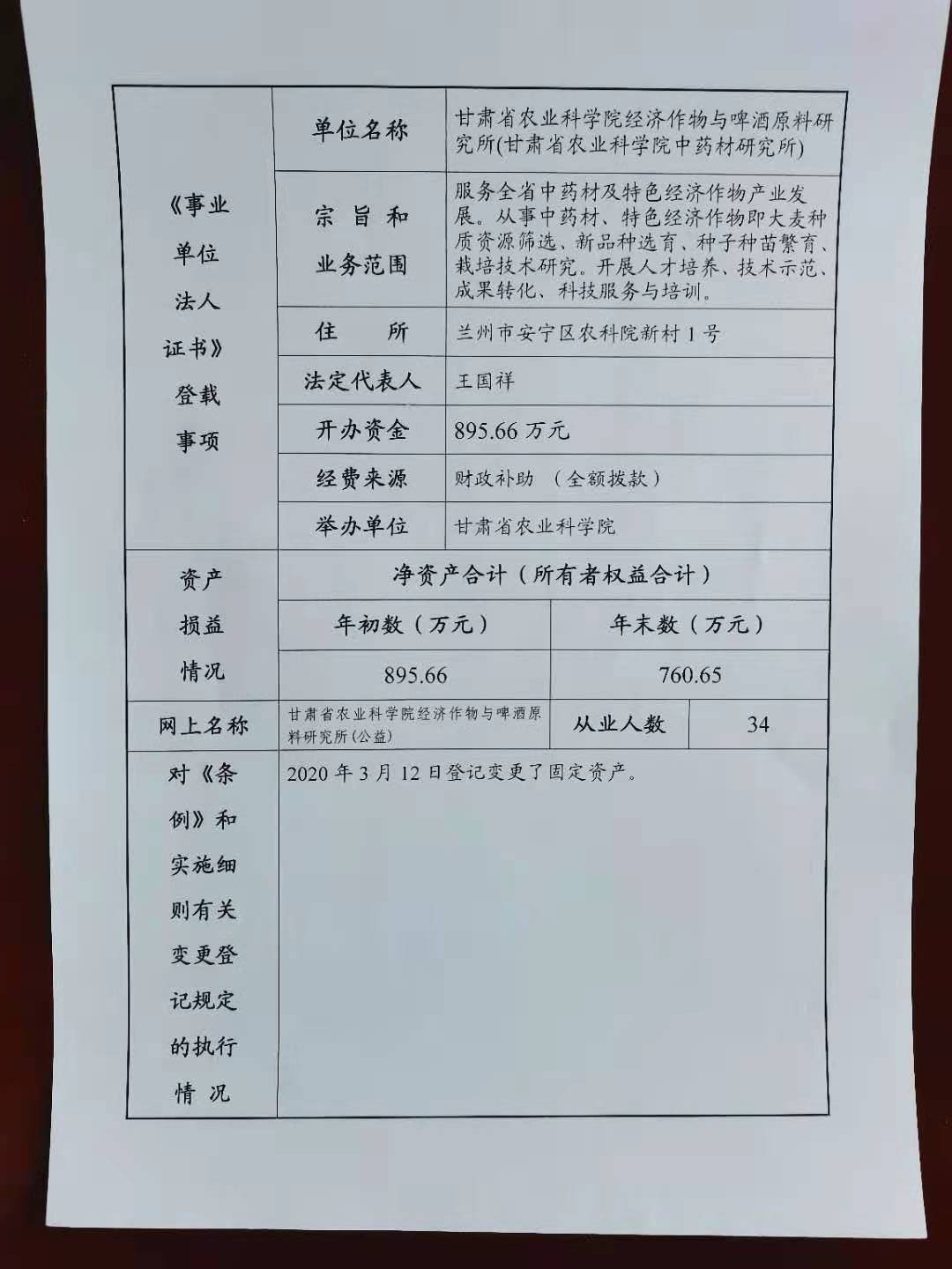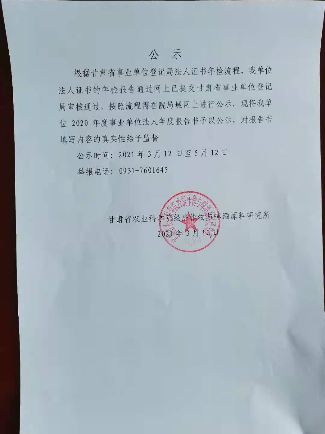 根据甘肃省事业单位登记局法人证书年检流程,我单位法人证书的年检报告书通过网上已提交甘肃省事业单位登记局审核通过,按流程需在院局域网上进行公示,现将我单位2020年度事业单位法人年度报告书予以公示,对报告书填写内容的真实性给予监督。