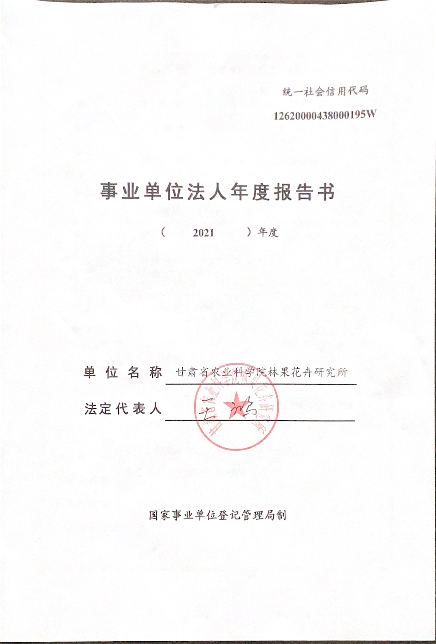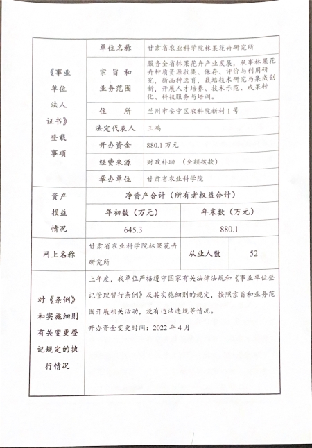根据甘肃省事业单位登记局法人证书年检流程,现将我单位2021年度事业单位法人年度报告书在院局域网予以公示,对报告书填写内容的真实性给予监督。