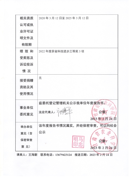 根据甘肃省事业单位登记局法人证书年检流程,我单位法人证书的年检报告书通过网上已提交甘肃省事业单位登记局审核通过,按流程需在院局域网上进行公示,现将我单位2022年度事业单位法人年度报告书予以公示,对报告书填写内容的真实性给予监督。