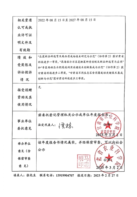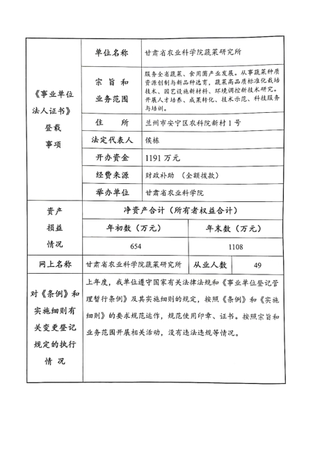 根据甘肃省事业单位登记局法人证书年检流程,我单位法人证书的年检报告书通过网上已提交甘肃省事业单位登记局审核通过,按流程需在院局域网上进行公示,现将我单位2022年度事业单位法人年度报告书予以公示,对报告书填写内容的真实性给予监督。