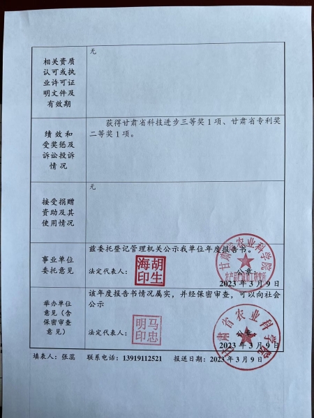 根据甘肃省事业单位登记局法人证书年检流程,我单位法人证书的年检报告书通过网上已提交甘肃省事业单位登记局审核通过,按流程需在院局域网上进行公示,现将我单位2022年度事业单位法人年度报告书予以公示,对报告书填写内容的真实性给予监督。
