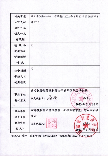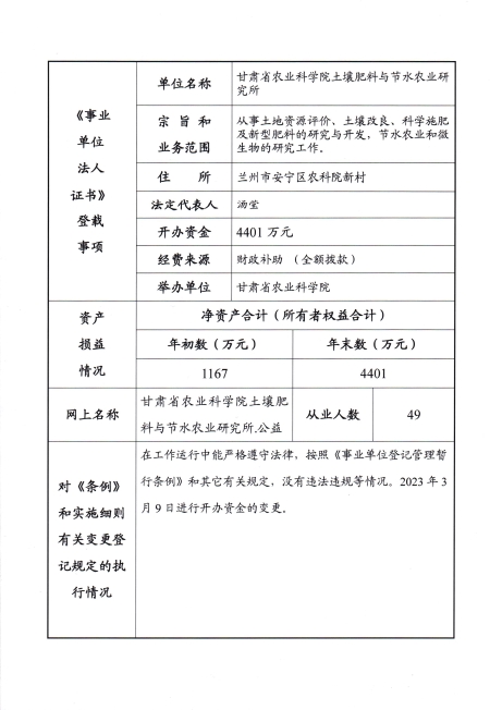 根据甘肃省事业单位登记局法人证书年检流程,我单位法人证书的年检报告书已通过网络提交甘肃省事业单位登记局审核通过,按照流程,现将我单位2022年度事业单位法人年度报告书予以公示,对报告书填写内容的真实性给予监督。