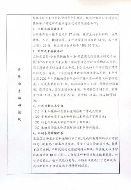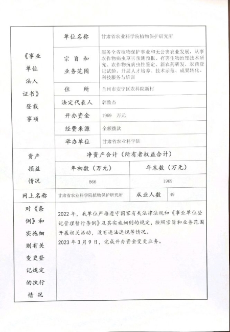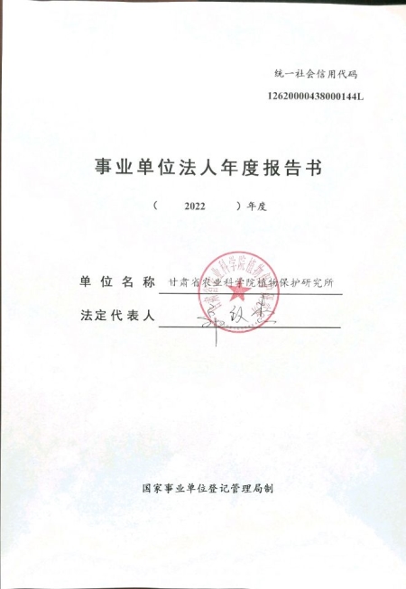 根据甘肃省事业单位登记局法人证书年检流程,我单位法人证书的年检报告书需在院局域网上进行公示,现将我单位2022年度事业单位法人年度报告书予以公示,对报告书填写内容的真实性给予监督。