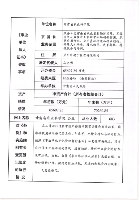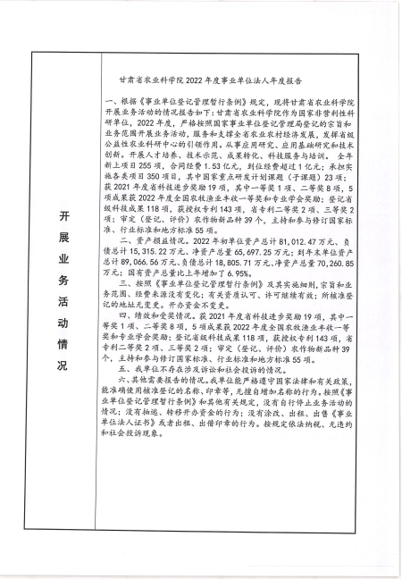 根据甘肃省事业单位登记局法人证书年检流程,现将我单位2022年度事业单位法人年度报告书予以公示,对报告书填写内容的真实性给予监督。